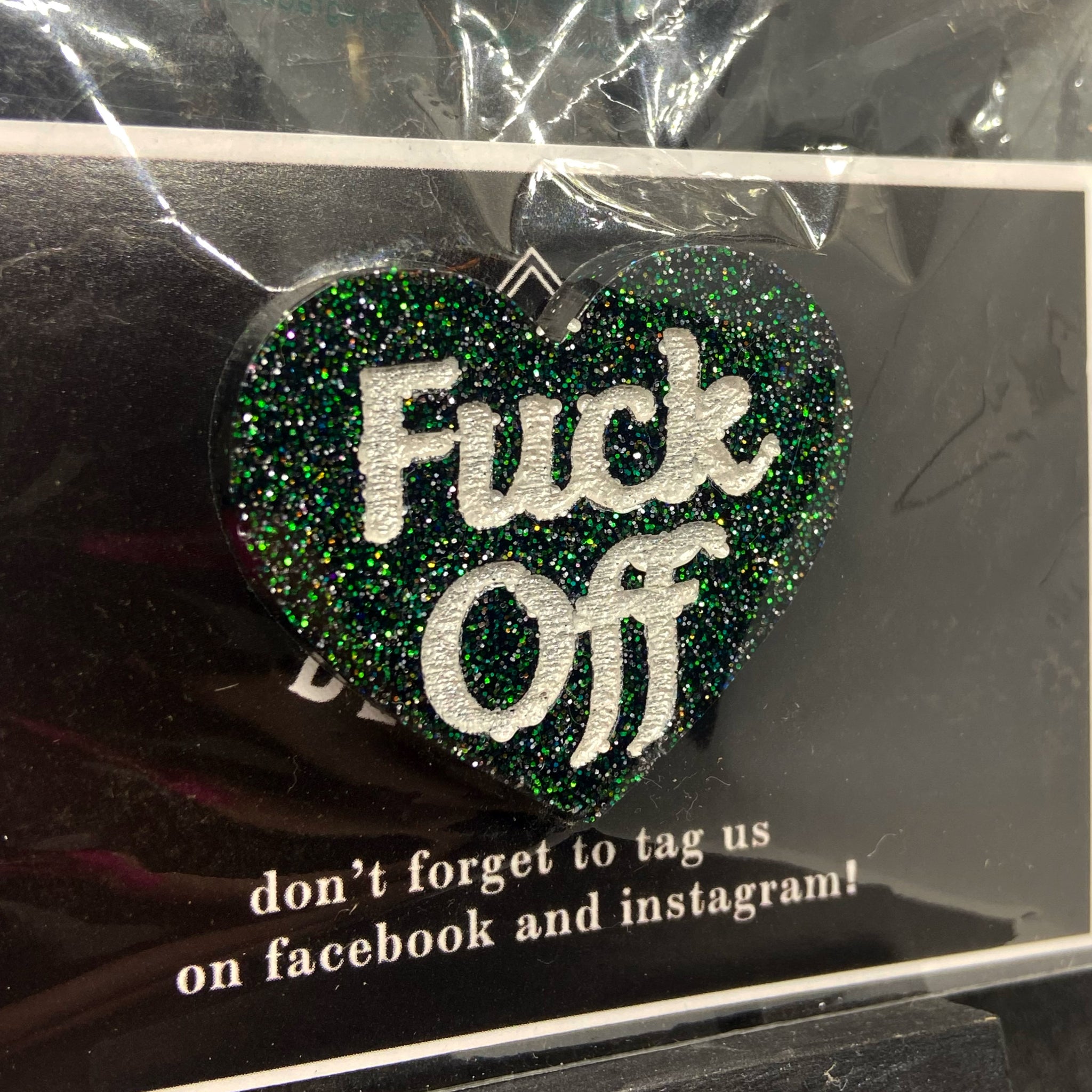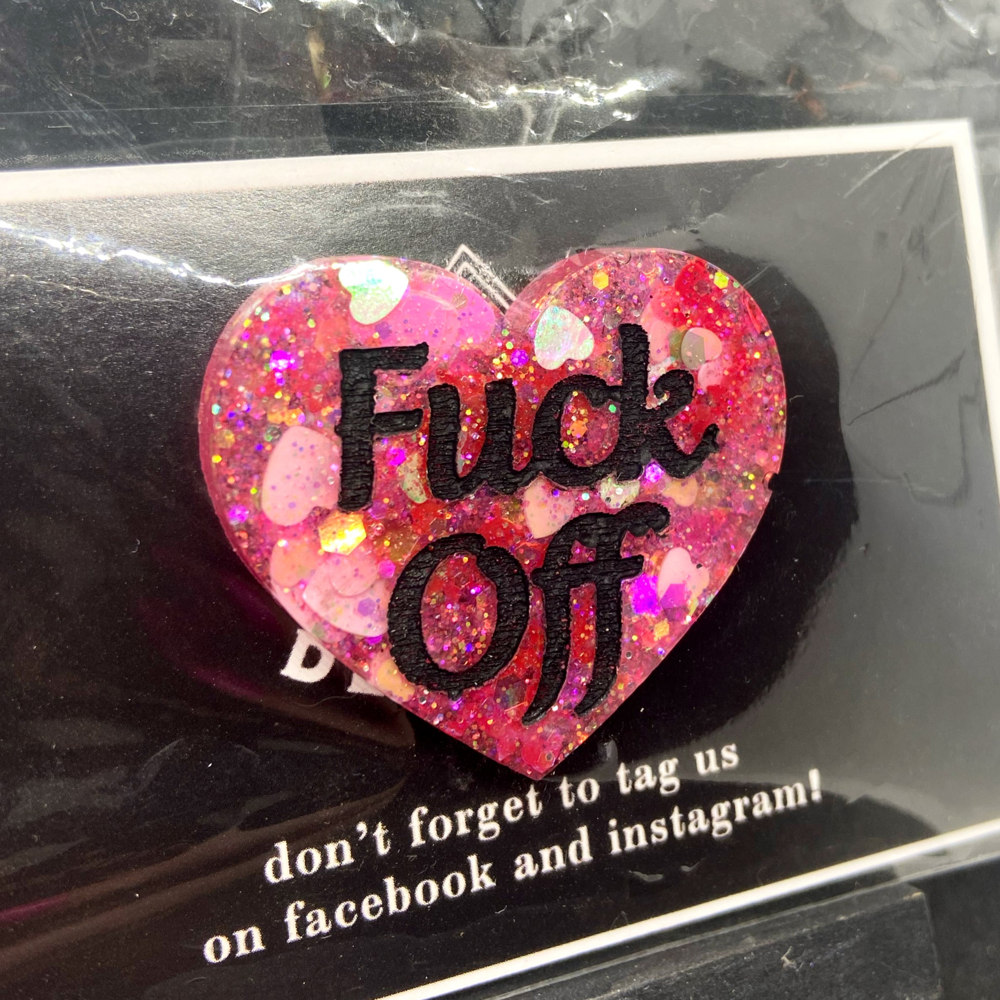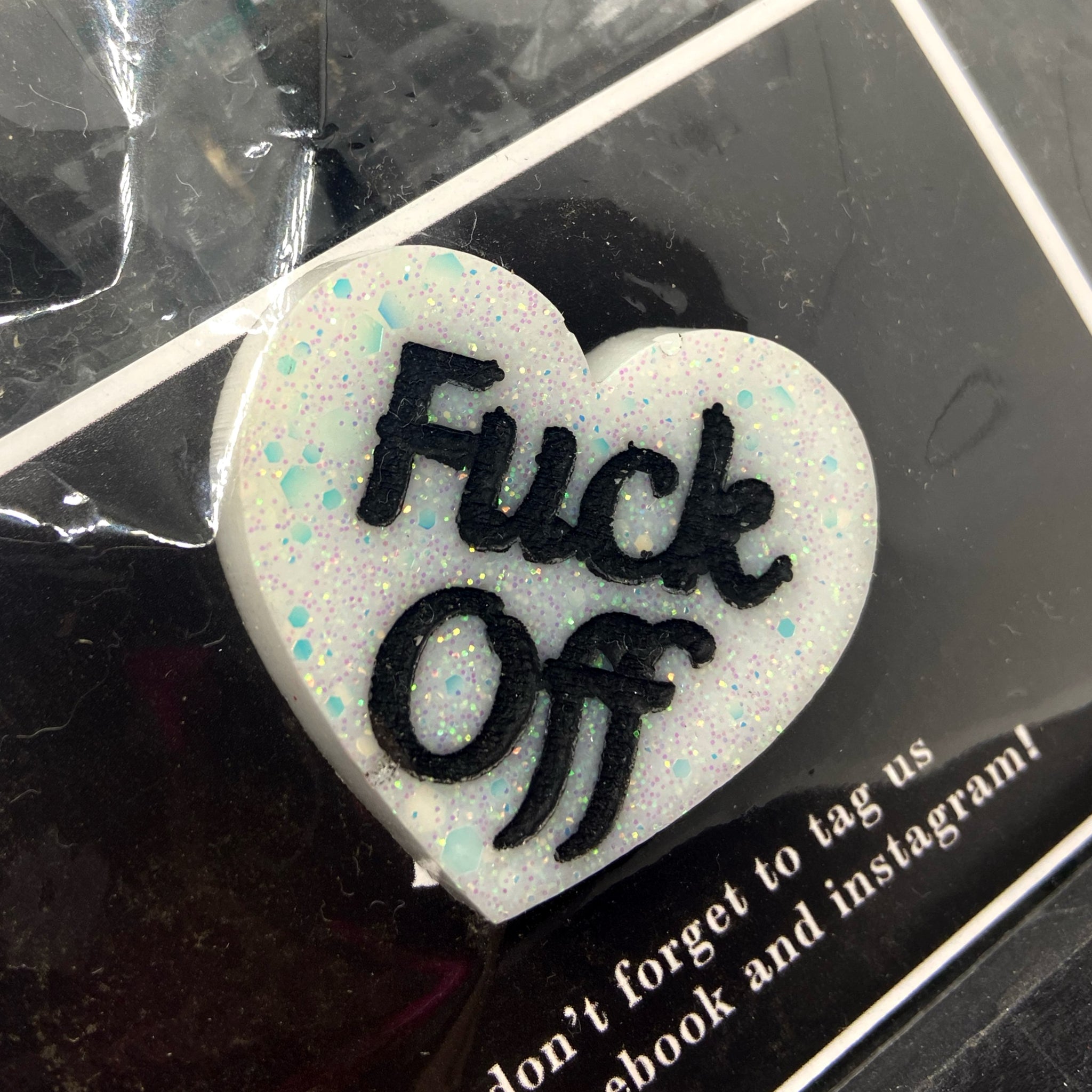 a heart shaped pin badge with the words ‘fuck off’.